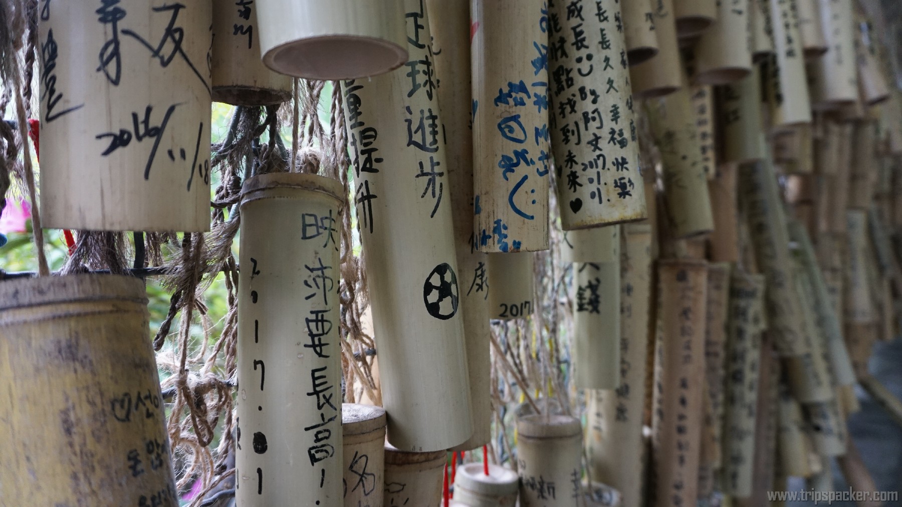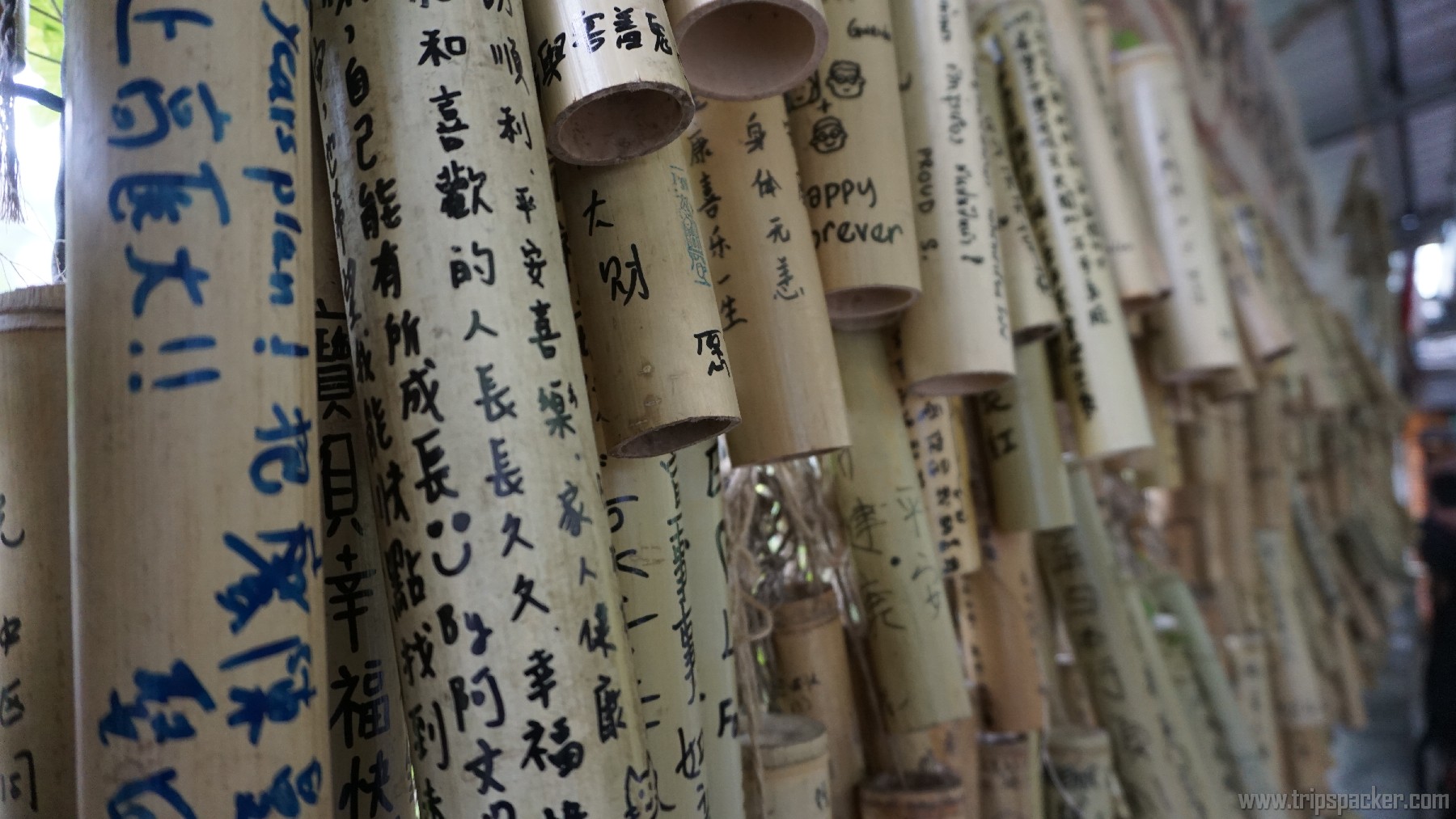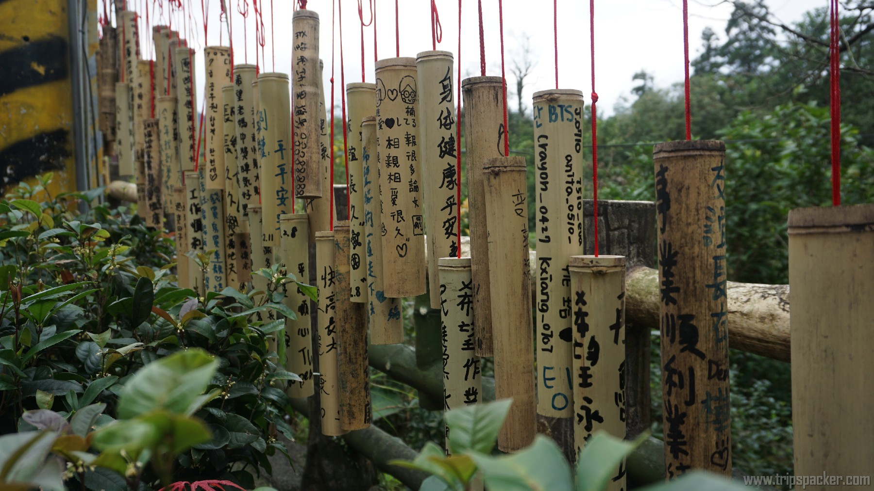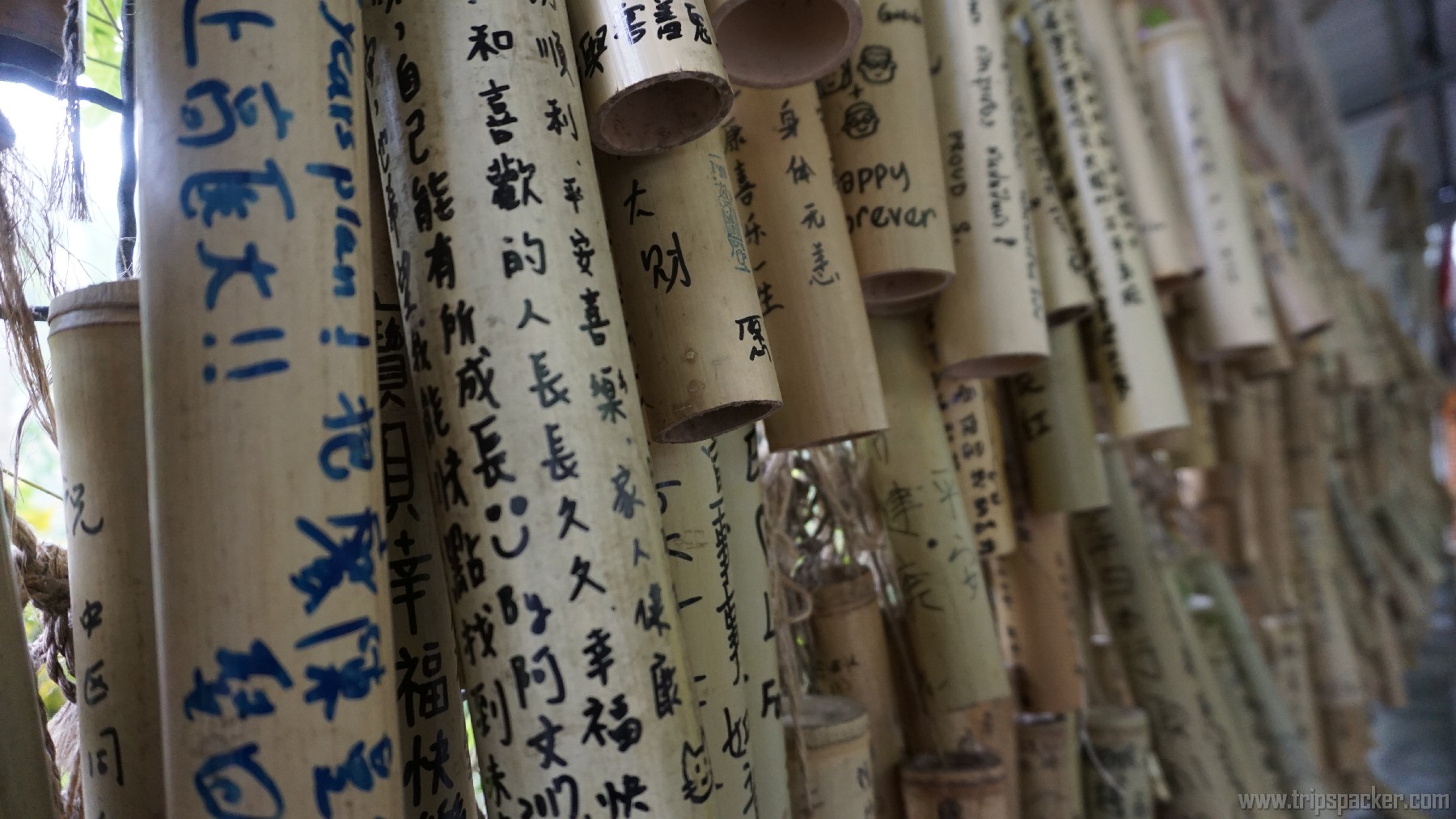 ลงจากรถไฟปุ๊ปก็จะเจอกลับมวลมหากระบอกไม้ไผ่ ซึ่งคนส่วนใหญ่จะมาเขียนคำอธิฐานขอพรกัน และจะเเขวนไว้ที่นี้ครับ