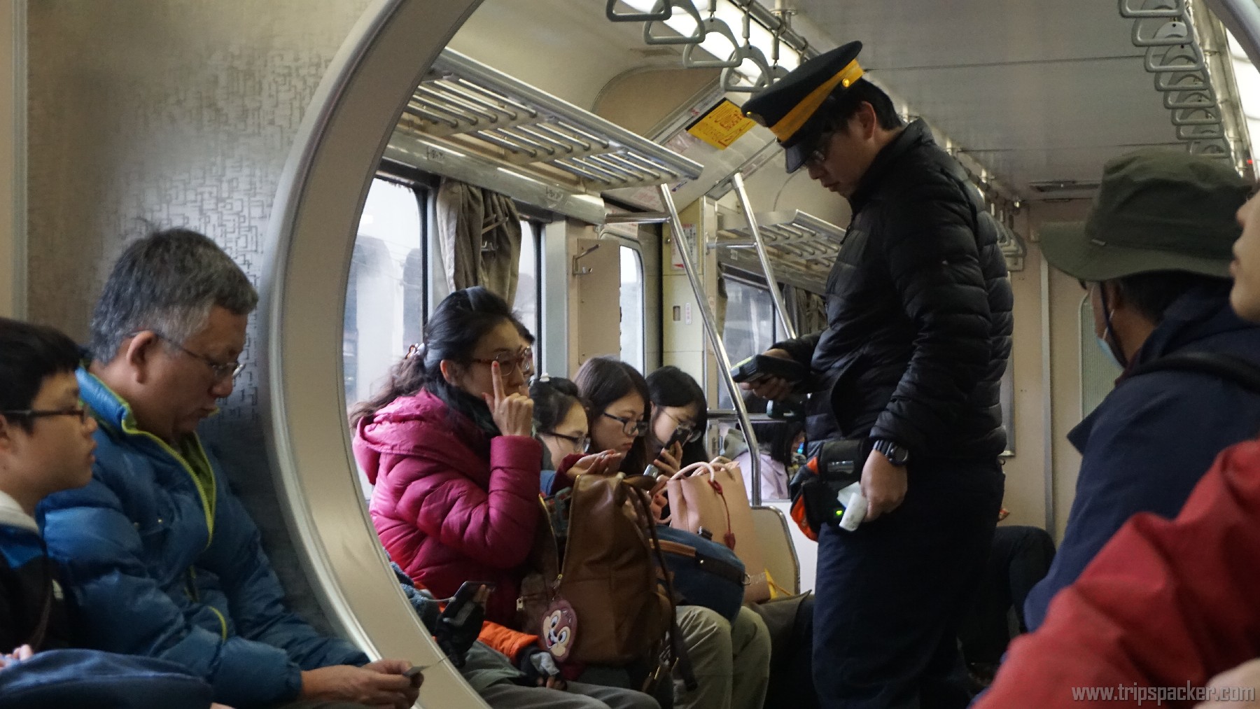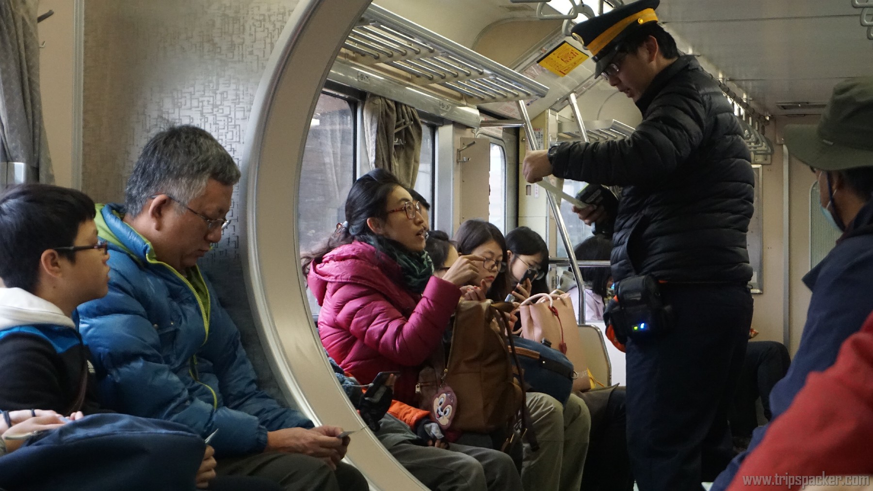 สักพักจะมีเจ้าหน้าประจำขบวนรถ เดินตรวจตั๋วโดยสารครับ หากใครซื้อตั๋วมาแล้วก็โชว์ตั๋วได้เลย แต่ถ้าใครยังไม่มีตั๋วก็สามารถซื้อตั๋วจากเจ้าหน้าที่ได้ทันทีครับ โดยในรูปจะสังเกตุเห็นว่าเจ้าหน้าที่จะมีเครื่อง PDA และ Slip Printer